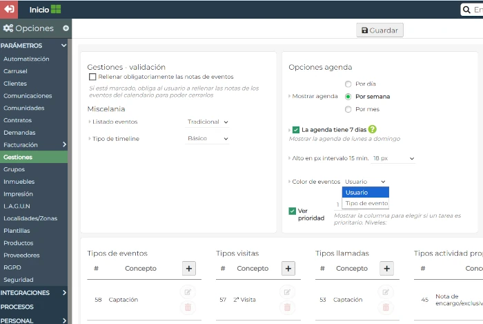 - Ara podeu mostrar els colors d'agenda per comercial o per tipus d'esdeveniment, per a això, aneu a Opcions->Parametres->Gestions. (Veure imatge inferior)